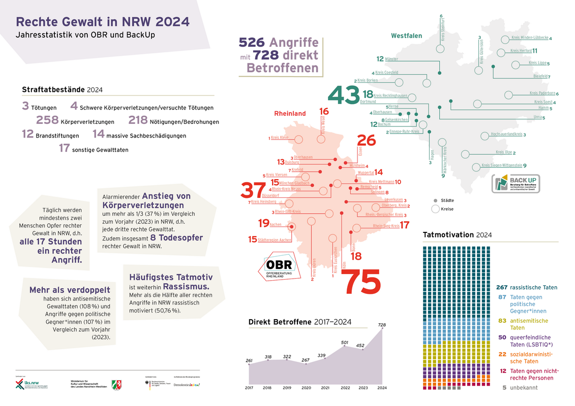 „Die Enthemmung rechter Gewalt ist für unsere Beratungsnehmer*innen deutlich spürbar“, so berichtet Lara Çelikel, Beraterin der OBR. Sabrina Hosono der OBR ergänzt: „In keinem Jahr seit Beginn unseres Monitorings gab es in NRW so viele Tote [8 Todesopfer] durch rechte Gewalt wie 2024. Diese Entwicklung ist alarmierend. Dabei bedroht rechte Gewalt gezielt Menschen, die als 'nicht zugehörig' markiert werden – sie richtet sich gegen unsere pluralistische Gesellschaft insgesamt.“