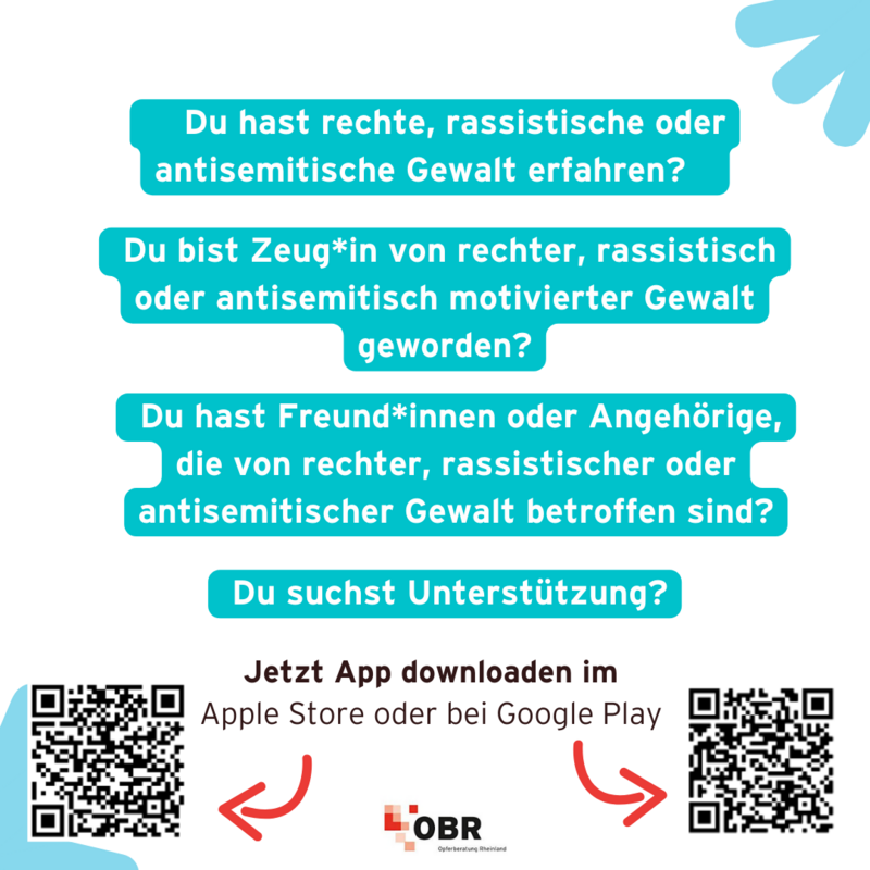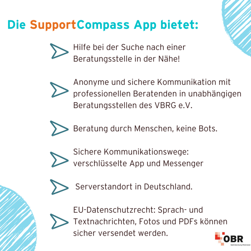 Die Opferberatung Rheinland erweitert ihr bestehendes Beratungsangebot um die Einführung der Onlineberatung mit Hilfe der App "SupportCompass". Personen, die die Unterstützung der OBR in Anspruch nehmen möchten, können sich nun - auch anonym - auf einem zusätzlichen niedrigschwelligen Weg an die Berater*innen der OBR wenden. Die App "SupportCompass" bietet Hilfe bei der Suche nach einer Beratungsstelle in der Nähe und ermöglicht eine verschlüsselte Kommunikation zwischen den ratsuchenden Personen und den Berater*innen. Auch Sprach- und Textnachrichten, Fotos und PDFs können sicher versendet werden. Im weiteren Beratungsprozess ist ebenfalls die Fortführung der Beratung per Telefon, per Video oder per aufsuchender Beratung möglich.