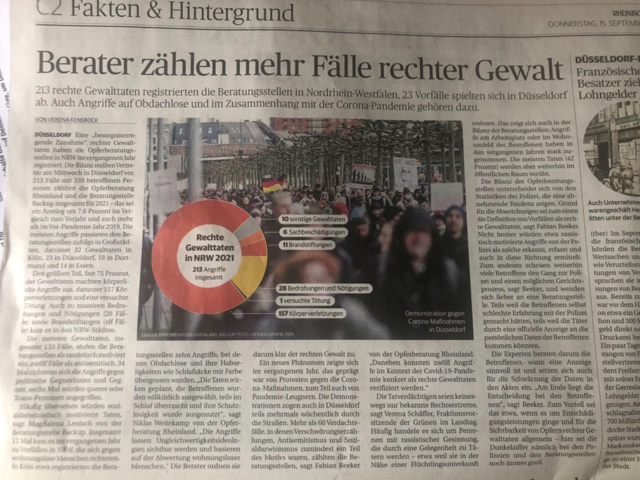 Artikel weiterlesen unter: Beratungsstellen zählen mehr Fälle rechter Gewalt.14.09.2022 um 15:44 Uhr, Rheinische Post (Online / Zeitung)