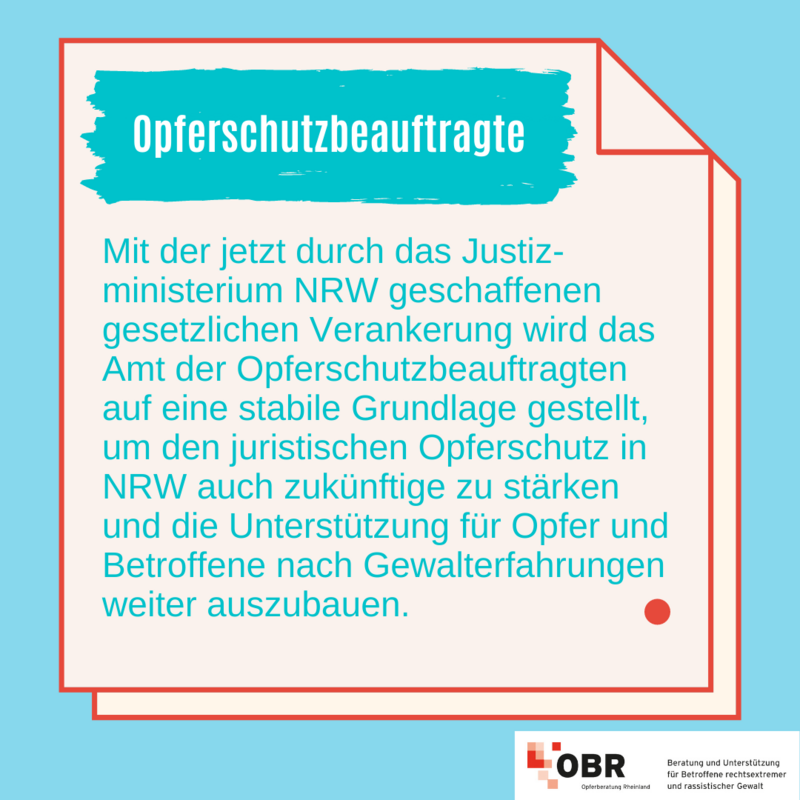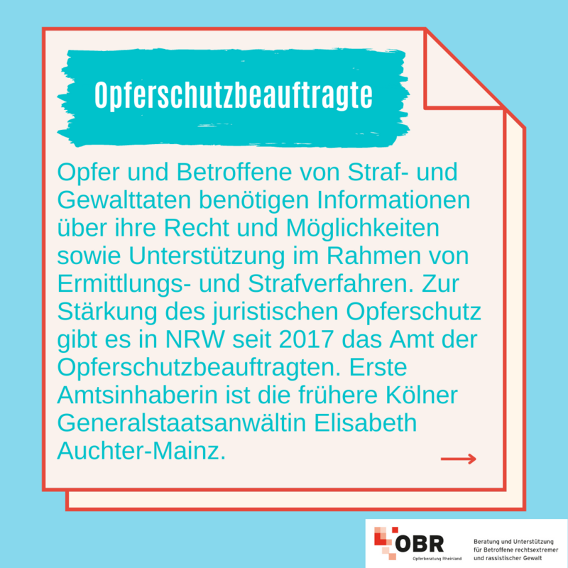 Opfer und Betroffene von Straf- und Gewalttaten benötigen Informationen über ihre Rechte und Möglichkeiten sowie Unterstützung im Rahmen von Ermittlungs- und Strafverfahren. Zur Stärkung des juristischen Opferschutz gibt es in NRW seit 2017 das Amt der Opferschutzbeauftragten. Erste Amtsinhaberin ist die frühere Kölner Generalstaatsanwältin Elisabeth Auchter-Mainz. Mit der jetzt [Anfang April 2022] durch das Justizministerium NRW geschaffenen gesetzlichen Verankerung wird das Amt der Opferschutzbeauftragten auf eine stabile Grundlage gestellt, um den juristischen Opferschutz in NRW auch zukünftig zu stärken und die Unterstützung für Opfer und Betroffene nach Gewalterfahrungen weiter auszubauen.