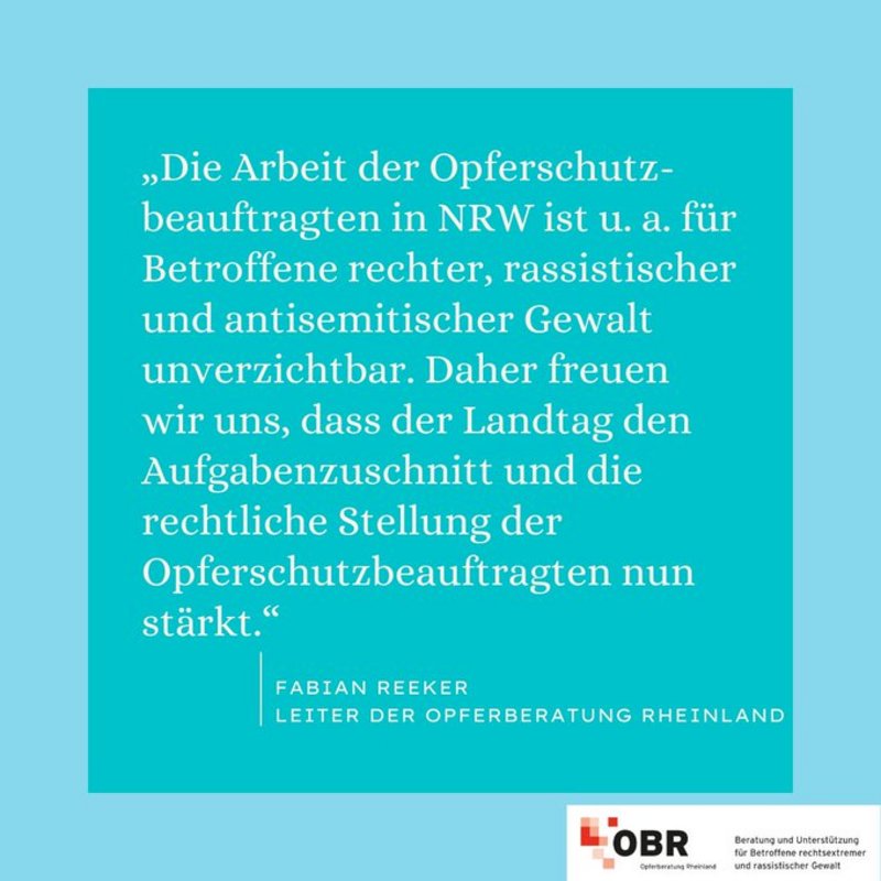 "Die Arbeit der Opferschutzbeauftragte|n in NRW ist u.a. für Betroffene rechter, rassistischer und antisemitischer Gewalt unverzichtbar. Daher freuen wir uns, dass der Landtag den Aufgabenzuschnitt und die rechtliche Stellung der Opferschutzbeauftragten nun stärkt", sagt Fabian Reeker, Leiter der Opferberatung Rheinland (OBR).